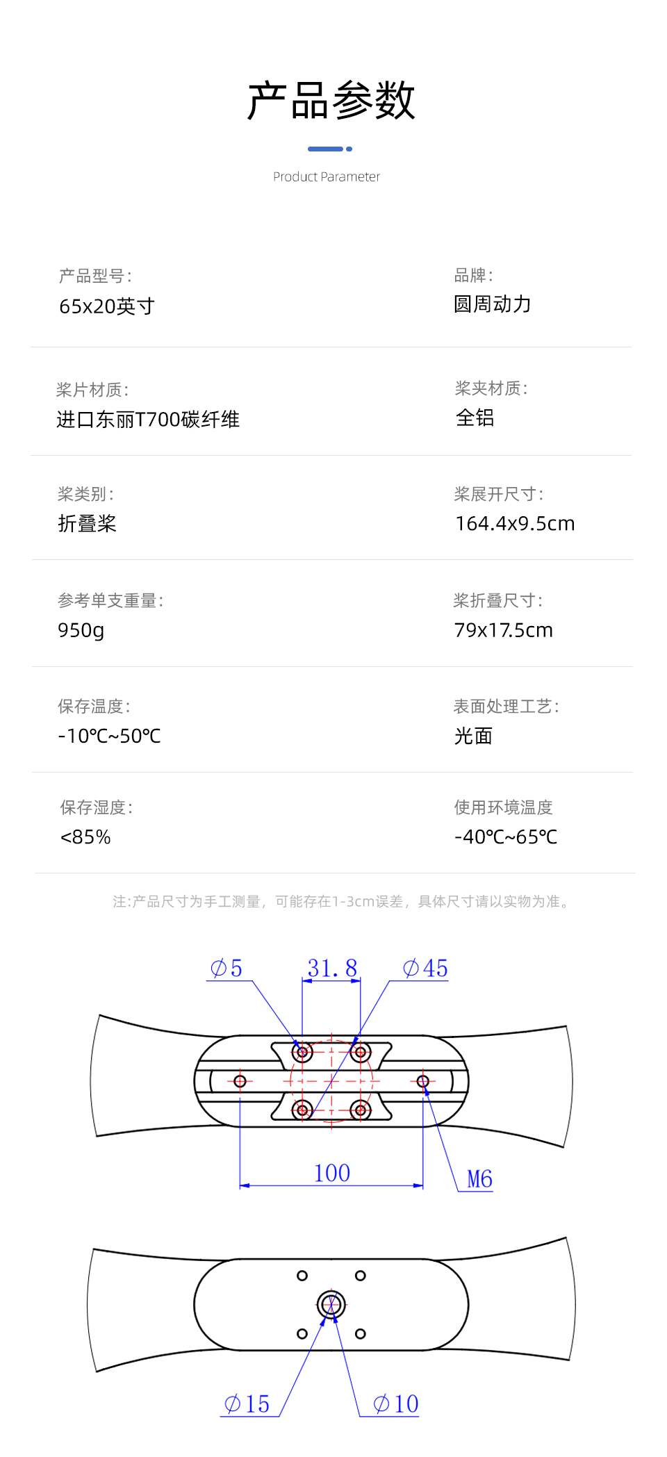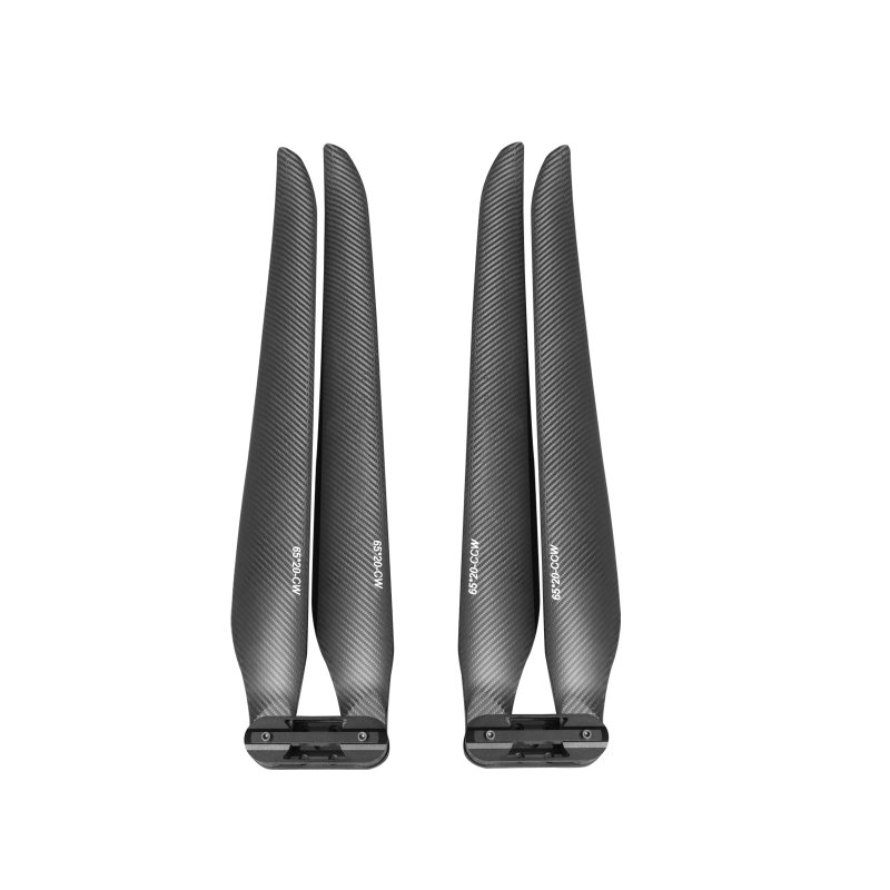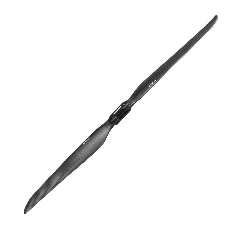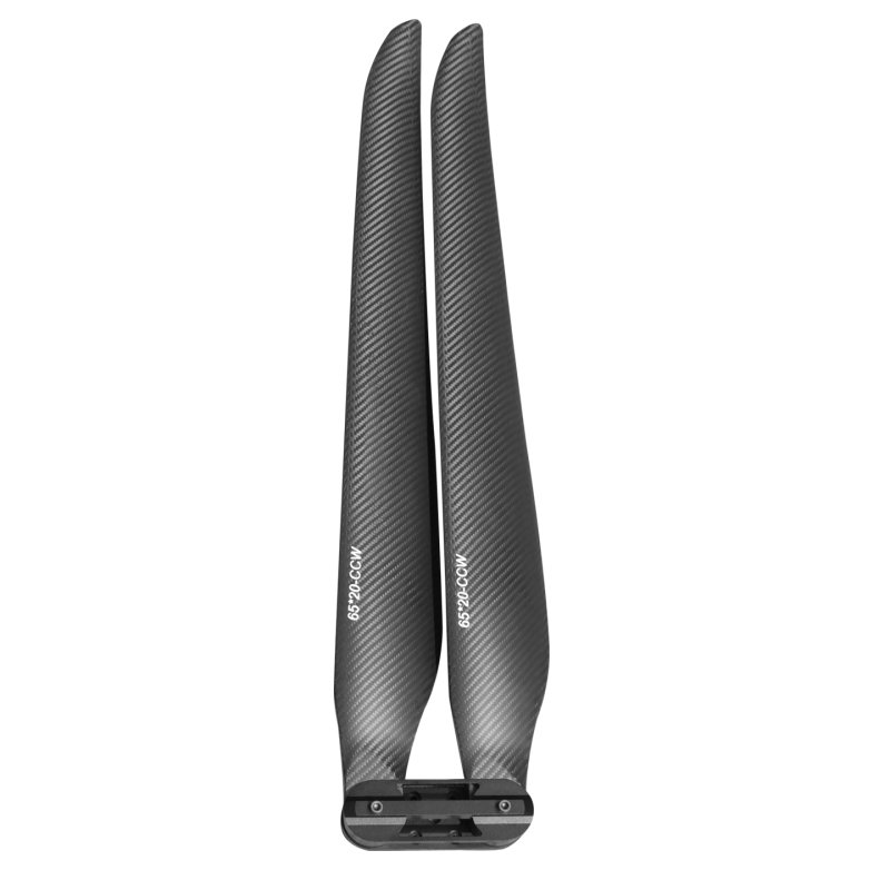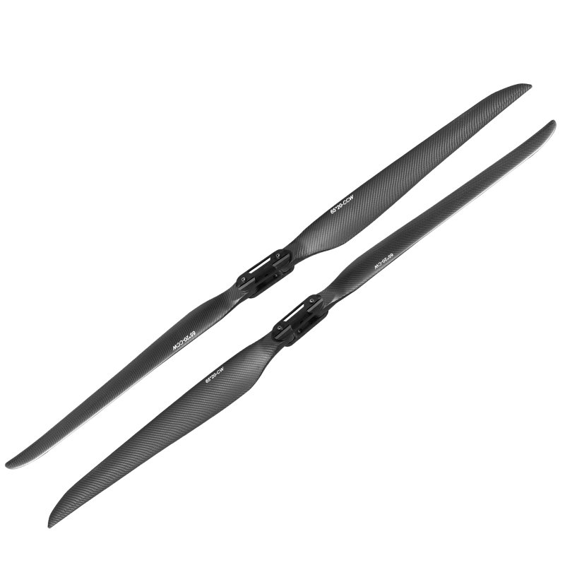 65x20英寸折叠桨叶,选用进口东丽T700碳纤维原料制造,强度更高,重量更轻,持久耐用,为减小涡流和噪音而特别设计的桨尖,符合空气动力学性能,每一片桨叶都经过严格的动平衡测试,高速旋转时保持稳定,震动极小